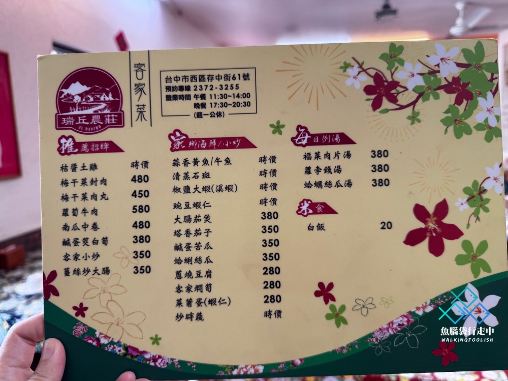 客家菜餚是我從小吃到大的家庭料理,親自品嚐瑞丘農莊,沒想到台中西區就能吃到一間非常道地的客家餐廳,完全可以納入台中美食餐廳口袋名單;光是從菜單的桔醬土雞、梅干菜封肉、客家小炒、薑絲炒大腸、客家燜筍、菜脯蛋、福菜肉片湯等,就好像回到小時候阿婆年節準備的美味餐桌上。魚妹這邊直接放上菜單供大家參考哦!